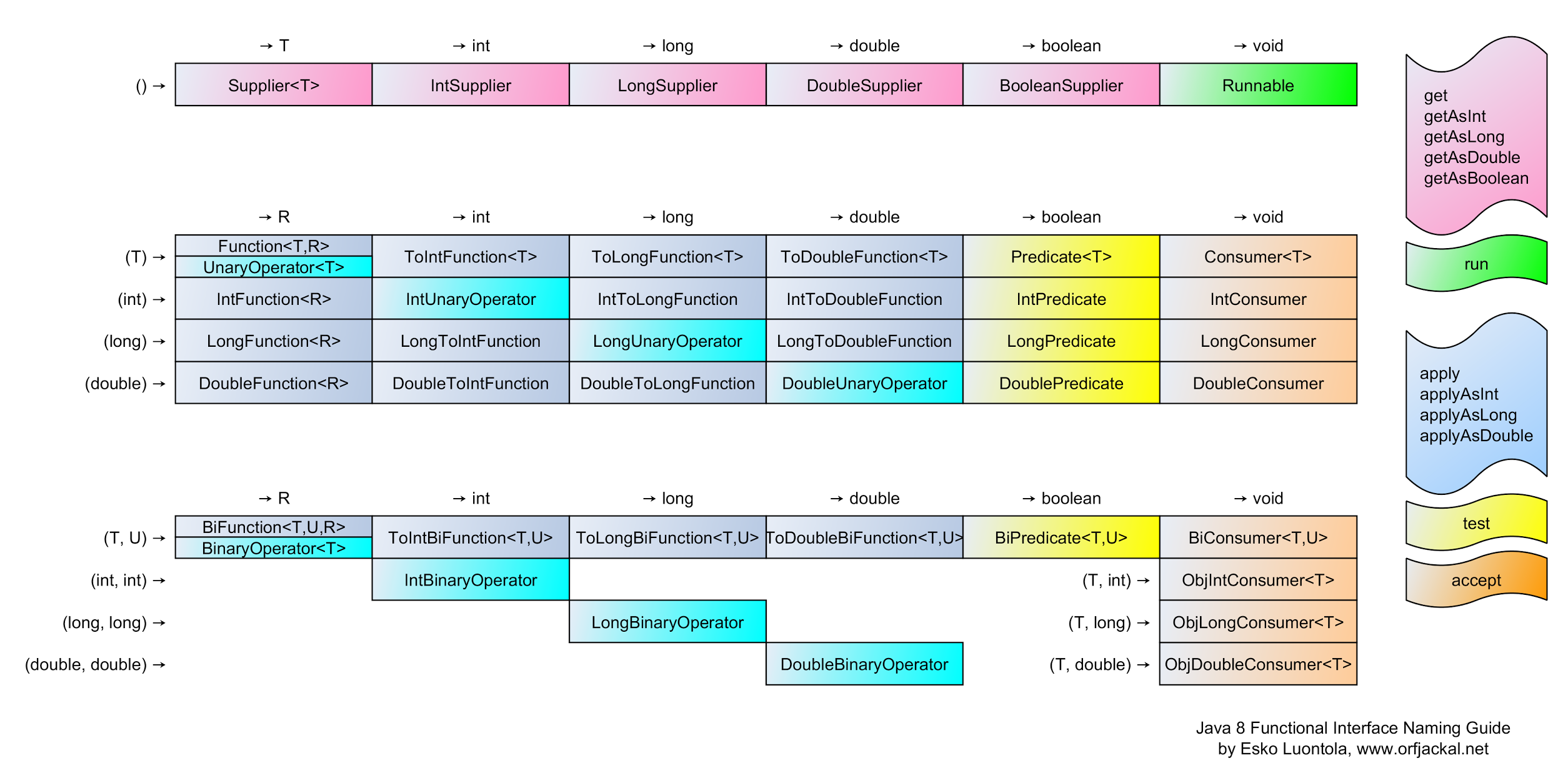 To make some sense out of this all, I wrote a program that generates the interface names based on the function's argument types and return type. The names it generates match those in the Java library. For this article I also made visualization which you can see below.
